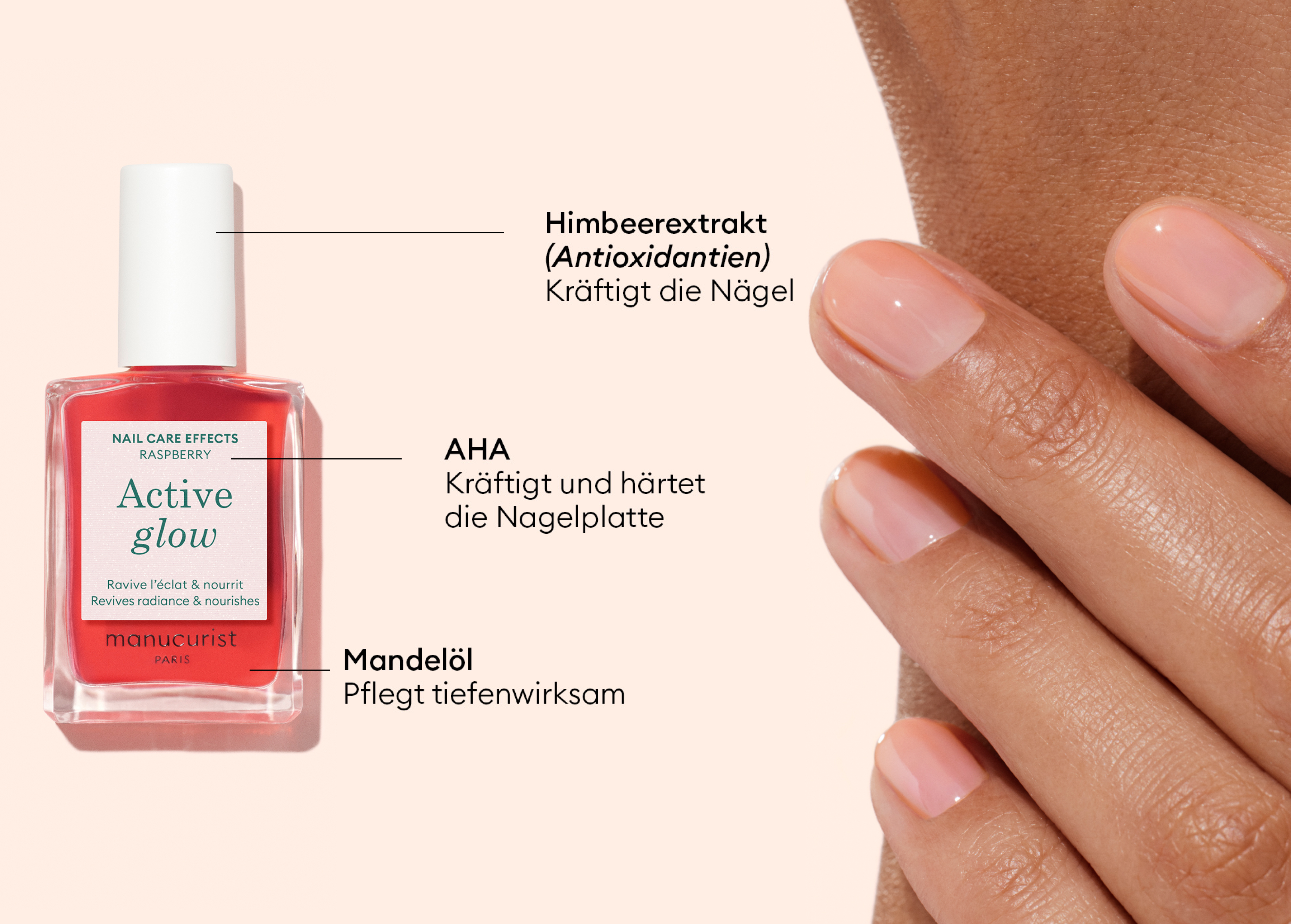 Wenn Sie sehr stark beschädigte Nägel haben, können Sie den SOS-Pflege-Base-Coat problemlos mit unserem hybriden Pflege-Nagellack Active Glow™ für einen unmittelbaren gesunden Glanzeffekt kombinieren. Active Glow™ enthält jedoch bereits Wirkstoffe für die Nagelpflege (Himbeerextrakte mit beruhigenden und regenerierenden Eigenschaften, AHAs, die selbst stark geschädigte Nägel regenerieren und revitalisieren, und Süßmandelöl, das die Nägel und Nagelhäute intensiv nährt). Es ist ein echter 2-in-1-Pflege- und Schönheitslack.