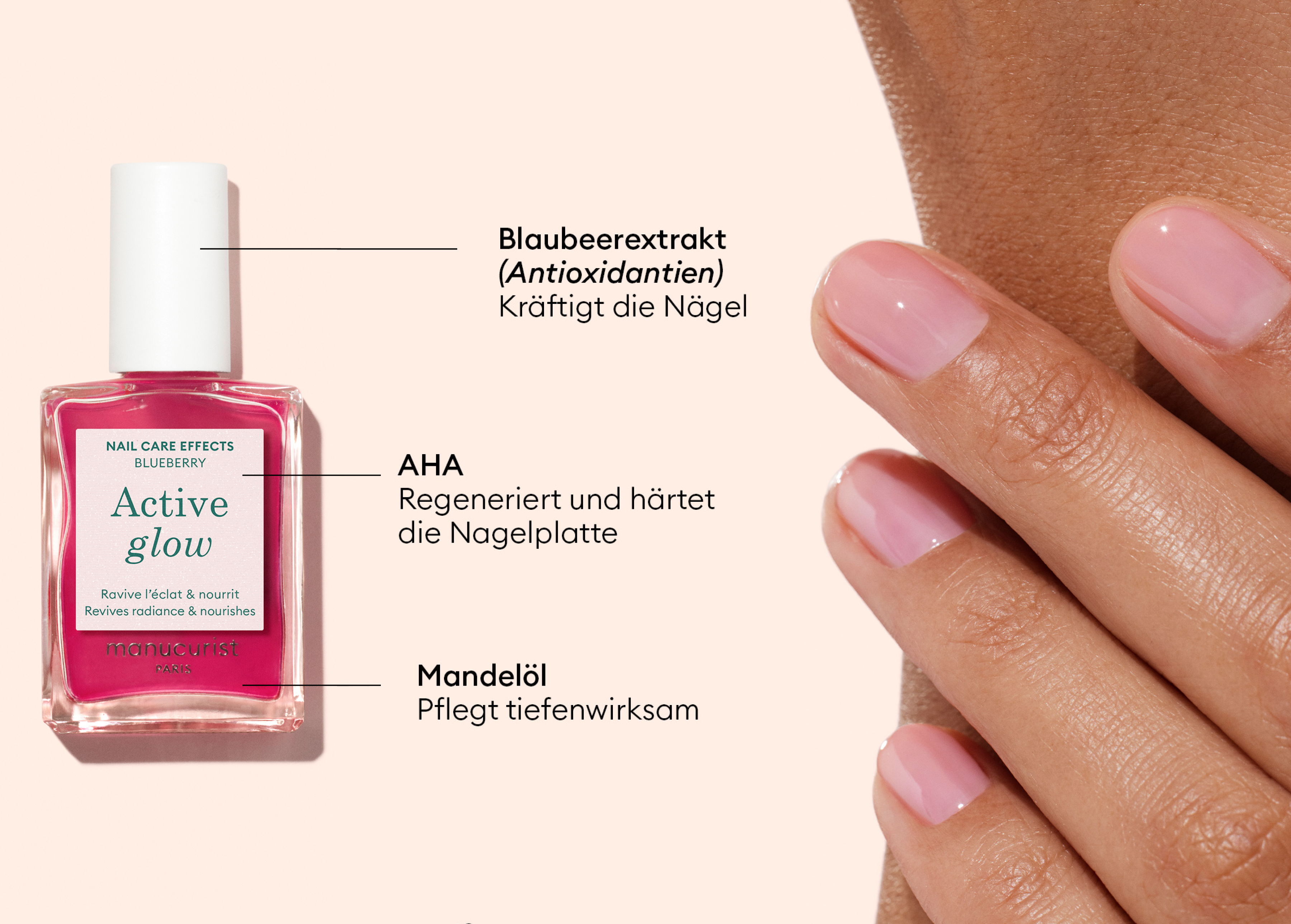 Die erfahrene Formel von Active Glow ist mit beruhigenden und regenerierenden pflanzlichen Wirkstoffen angereichert, die den Nägeln eine saure und rosige Form verleihen.
