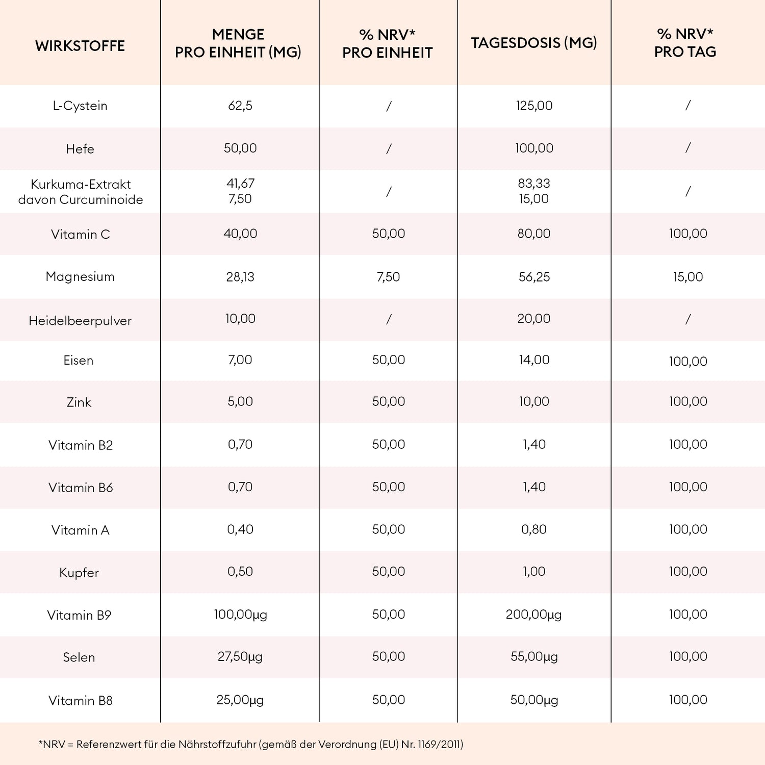 Nahrungsergänzungsmittel auf Basis von Vitaminen, Mineralstoffen, Pflanzen, Hefe und L-Cystein.