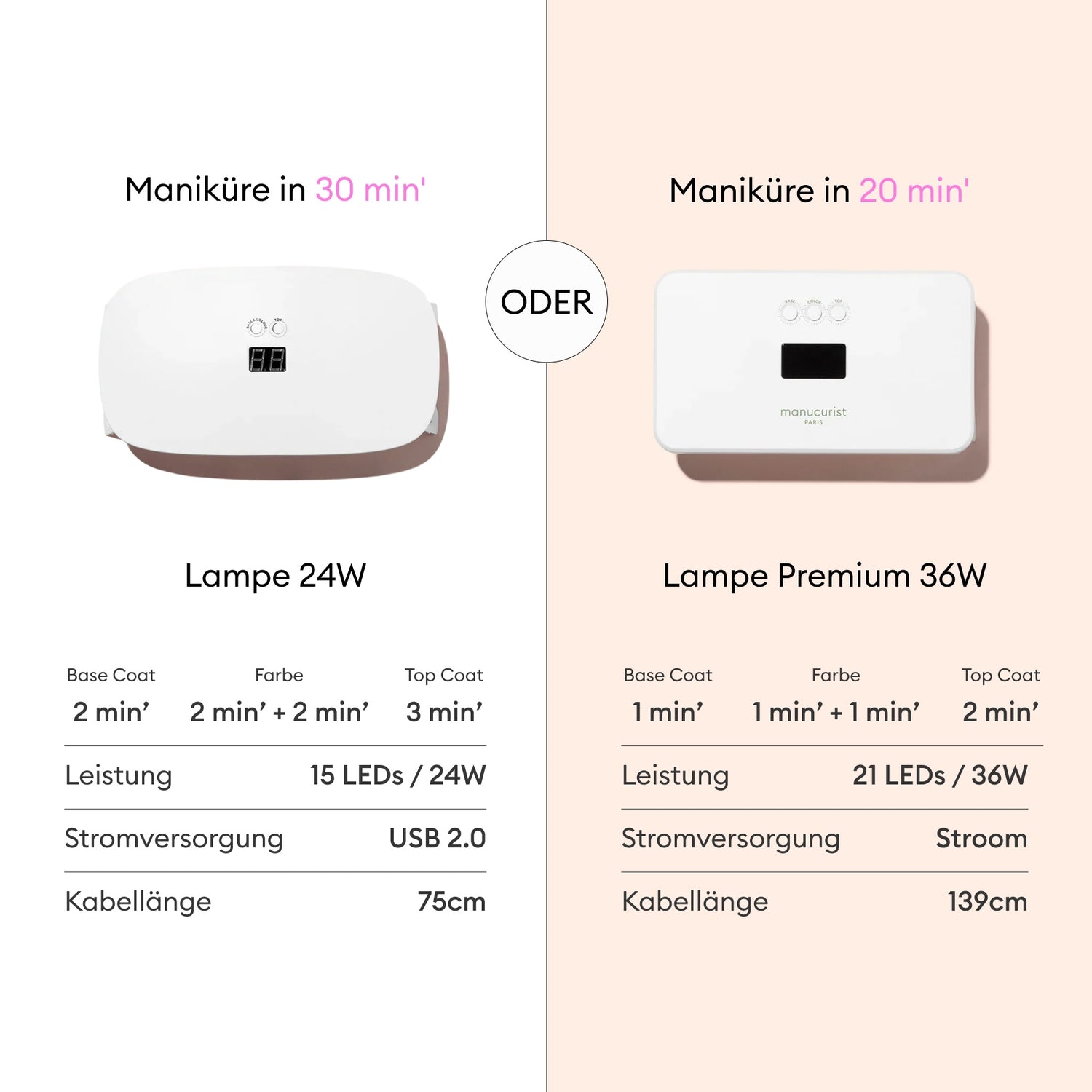 Sofortige Trocknung: erfolgt unter Verwendung einer LED-Lampe mit mindestens 24 W, auf einer Frequenz, die im Vergleich zu UV-Lampen am wenigsten schädlich für die Nägel ist!