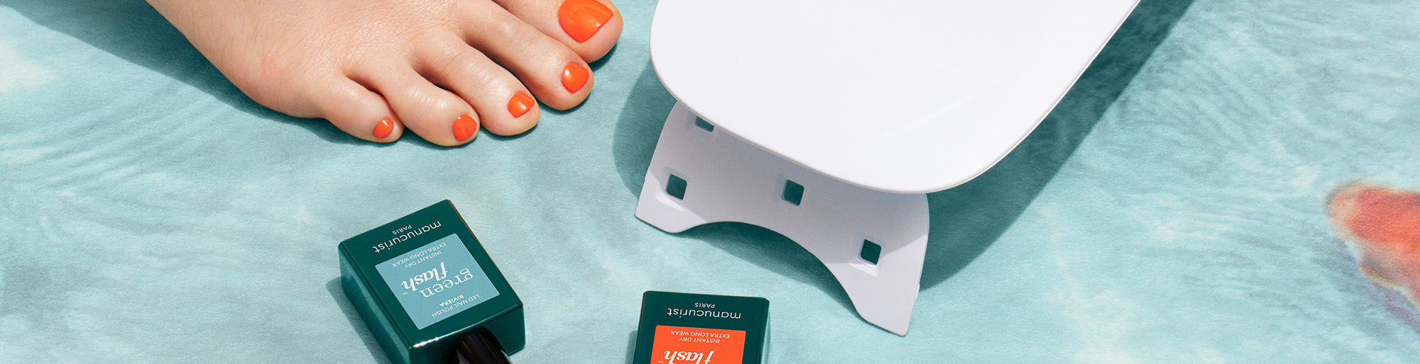 If you want to wear gel polish on your feet, we can only recommend Green Flash™ polish, the green and clean alternative to traditional gel polish. Its formula is up to 84% plant based and offers intense colour and a mirror shine for up to 10 days, as well as a removal process that does not damage your nails.