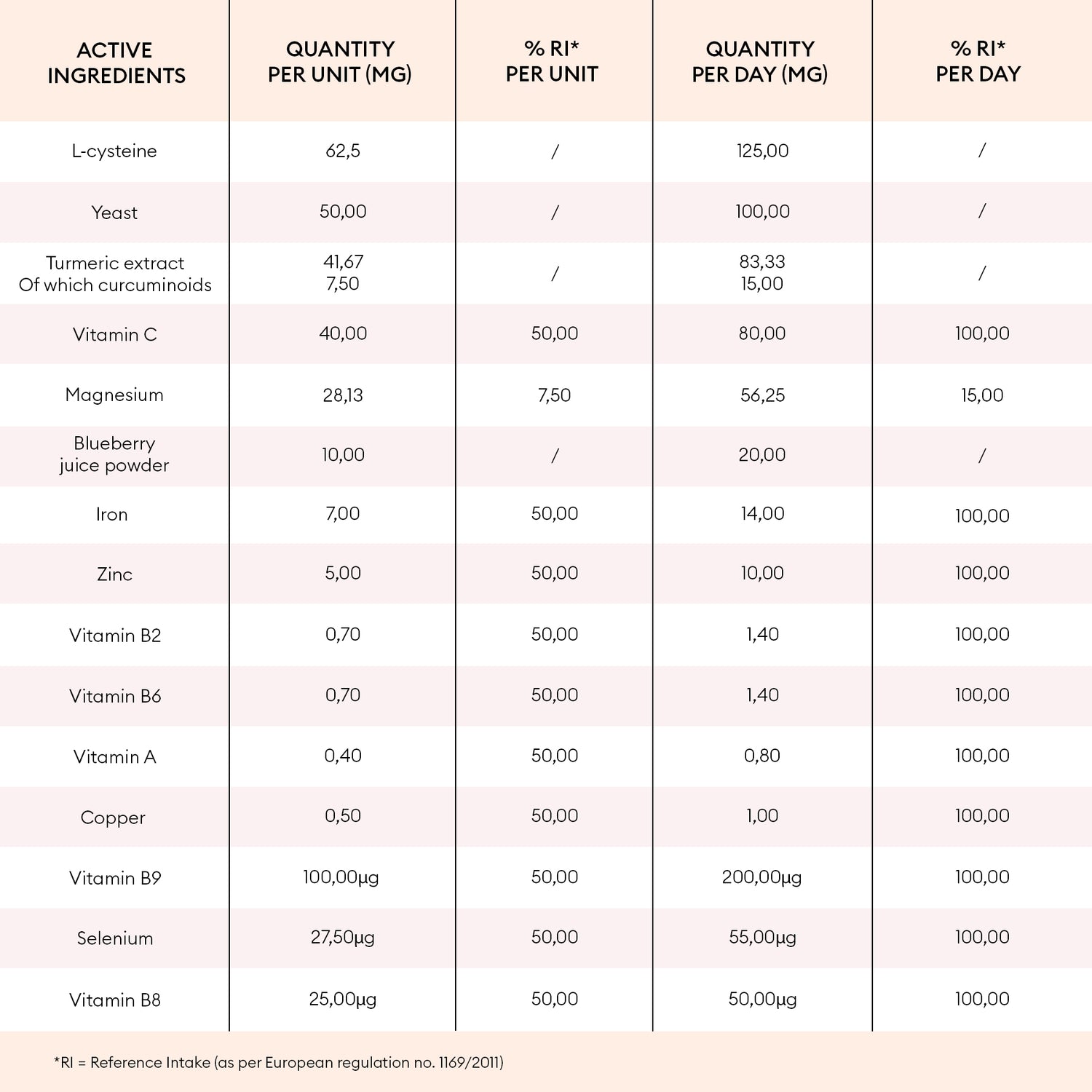 CARBONATE DE MAGNÉSIUM ; GÉLULE D’ORIGINE VÉGÉTALE (HYDROXYPROPYLMÉTHYLCELLULOSE); L-CYSTÉINE ; GLUCONATE DE FER; LEVURE NUTRITIONNELLE (SACCHAROMYCES CEREVISIAE) ; VITAMINE C ; EXTRAIT DE CURCUMA (CUR- CUMA LONGA) ; MALTODEXTRINE; CITRATE DE ZINC ; POUDRE DE MYRTILLE (VACCINIUM MYRTILLUS) ; VITAMINE A ; ANTI-AGGLO- MÉRANT : SELS DE MAGNÉSIUM D’ACIDES GRAS ; GLUCONATE DE CUIVRE; VITAMINES : B2, B6, B8, B9; SÉLÉNITE DE SODIUM