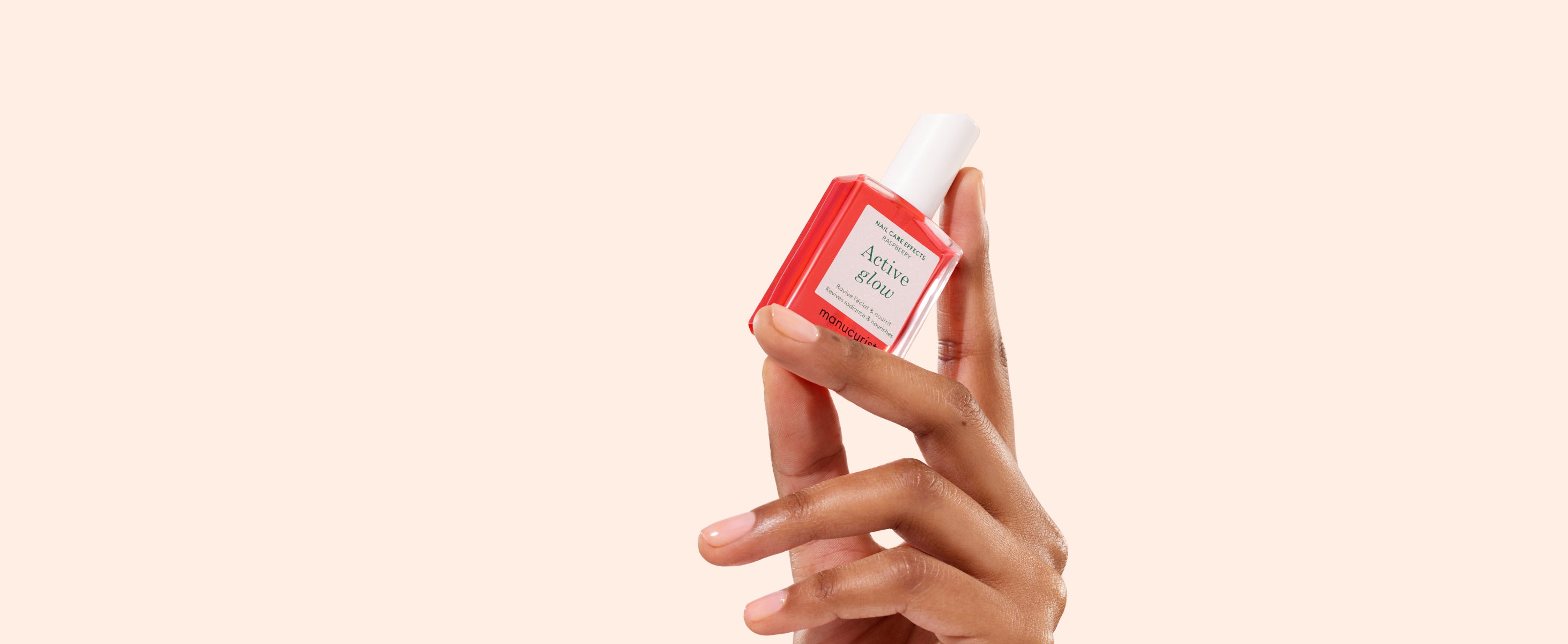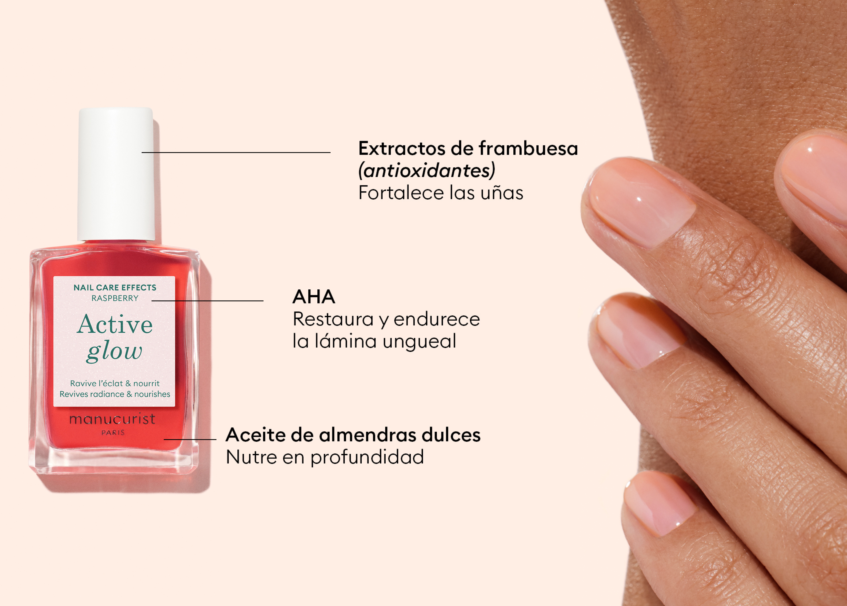 La fórmula experta de Active Glow está enriquecida con activos vegetales de propiedades calmantes y regenerativas que proporcionan a las uñas una forma agridulce y rosada.