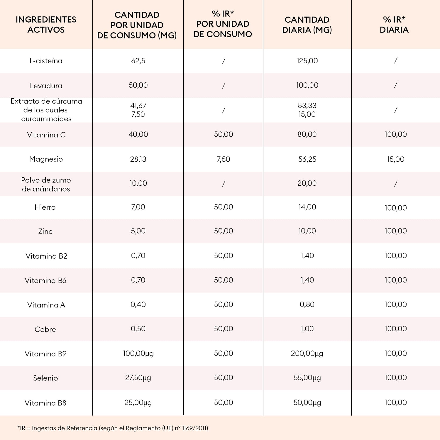 Complemento alimenticio a base de vitaminas, minerales, plantas, levadura y L-cisteína.
