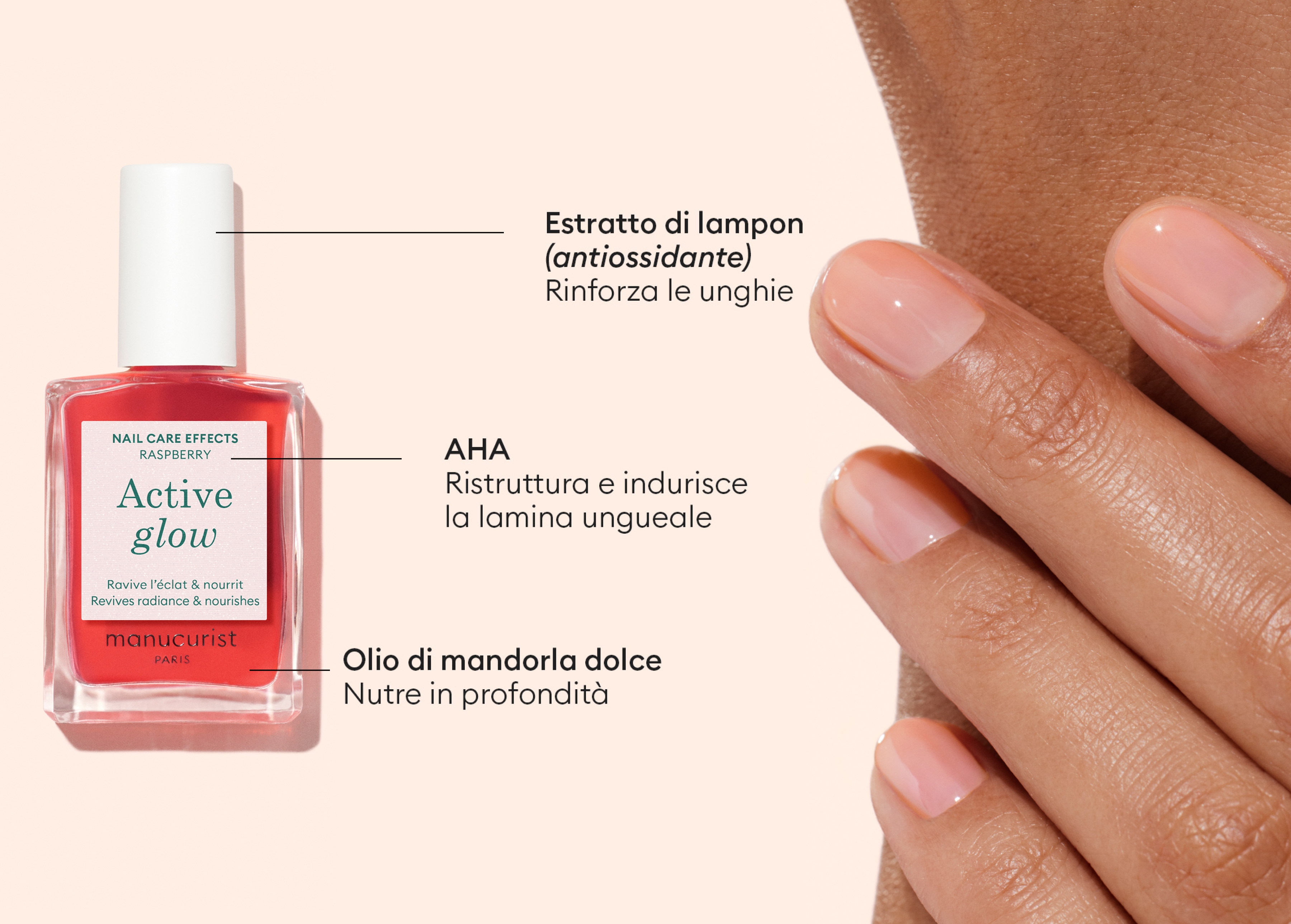 La formula esperta di Active Glow è arricchita con attivi vegetali dalle proprietà lenitive e rigeneranti che conferiscono alle unghie una forma acidula e rosata.