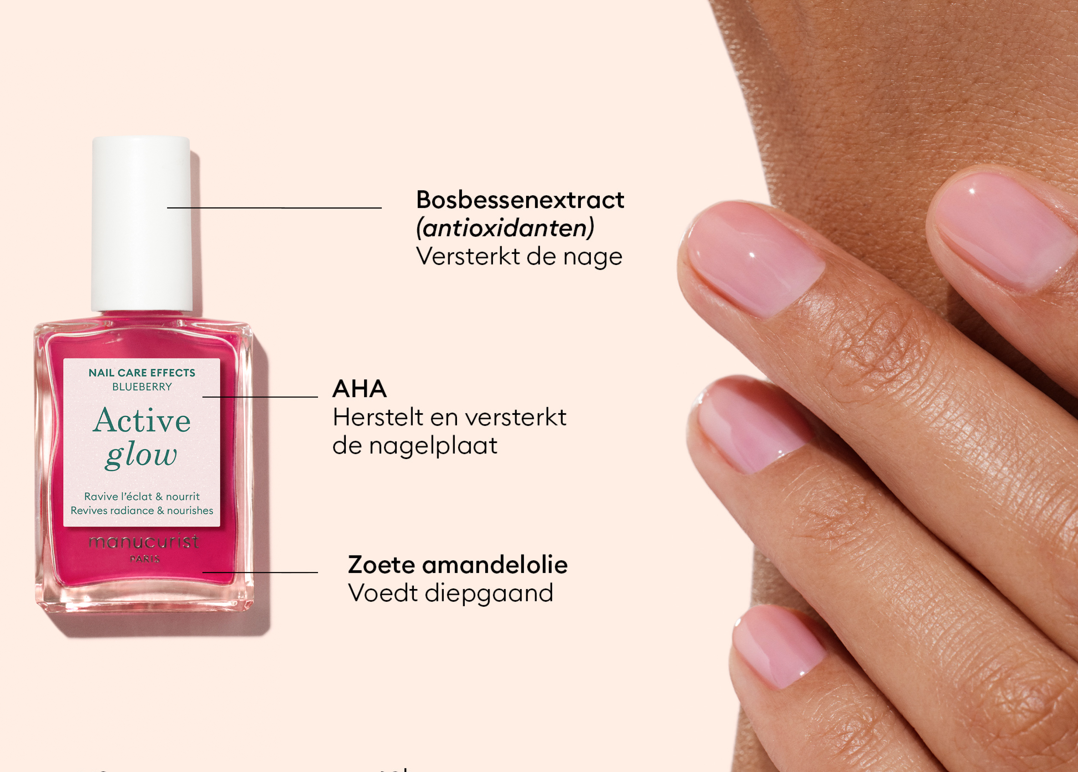 De deskundige formule van Active Glow is verrijkt met plantaardige actieve ingrediënten met kalmerende en regenererende eigenschappen, die de nagels een friszure en roze vorm geven