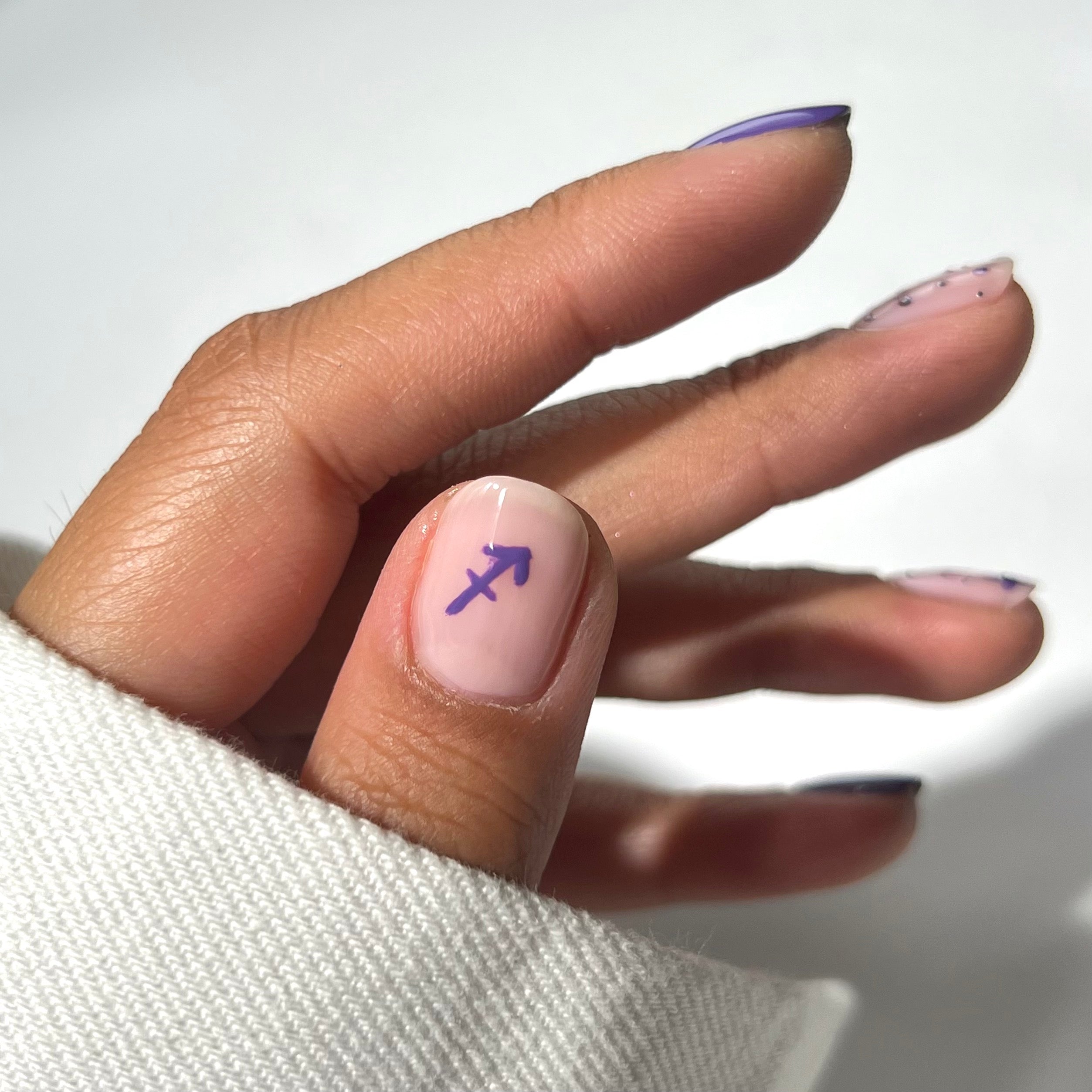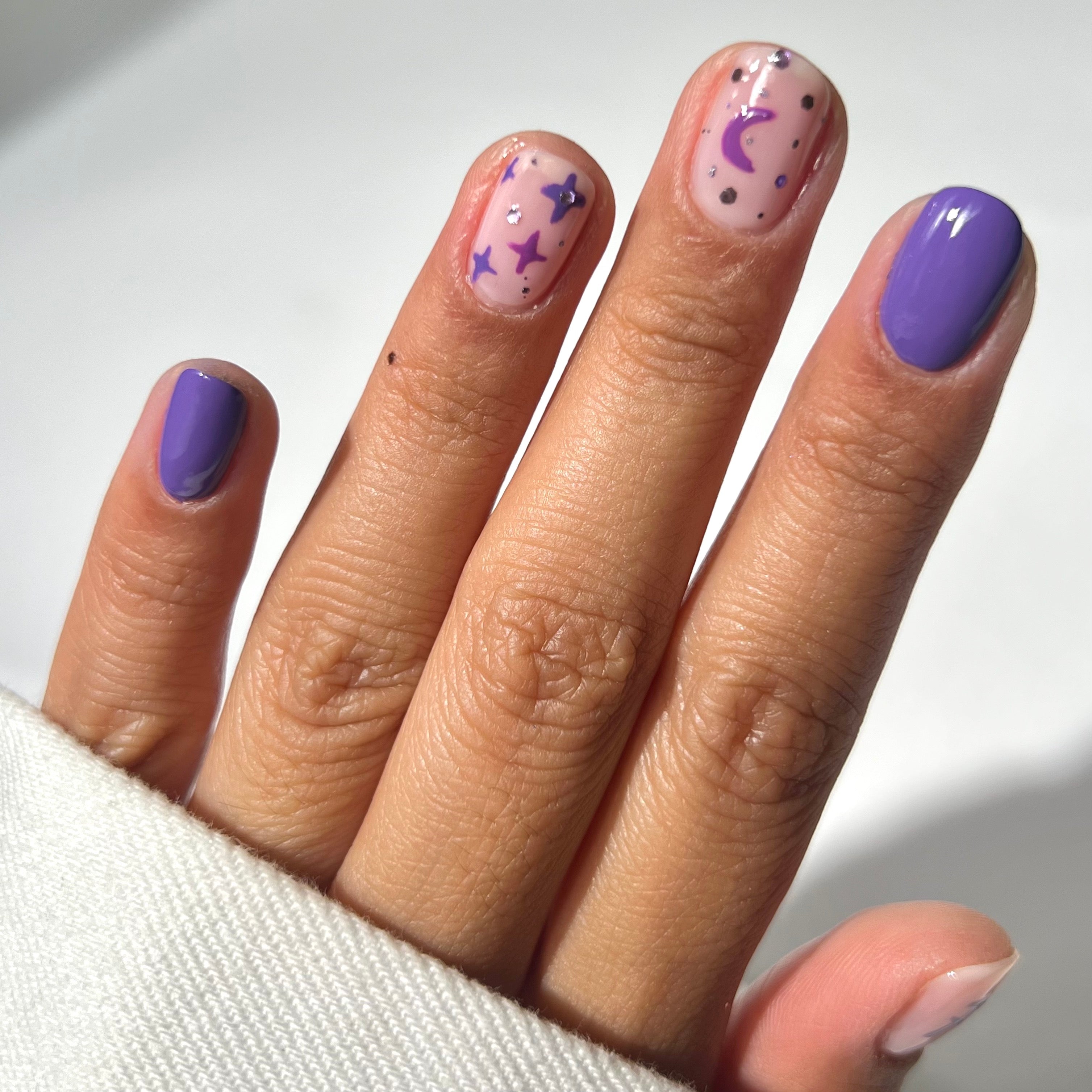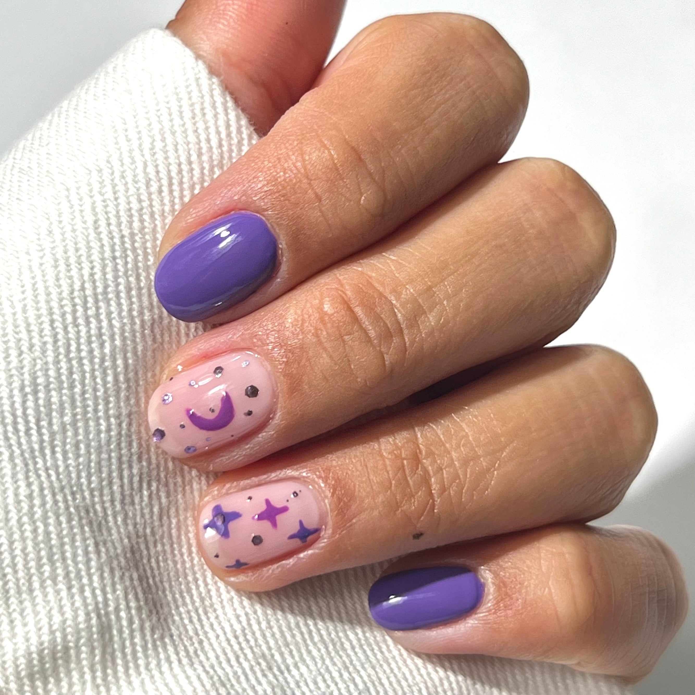 Iris en Violette zijn perfect voor deze nail art pop die een sterrenuniversum vol mysteriën weerspiegelt.