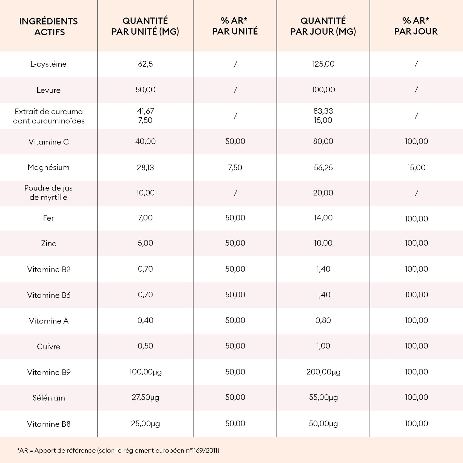 CARBONATE DE MAGNÉSIUM ; GÉLULE D’ORIGINE VÉGÉTALE (HYDROXYPROPYLMÉTHYLCELLULOSE); L-CYSTÉINE ; GLUCONATE DE FER; LEVURE NUTRITIONNELLE (SACCHAROMYCES CEREVISIAE) ; VITAMINE C ; EXTRAIT DE CURCUMA (CUR- CUMA LONGA) ; MALTODEXTRINE; CITRATE DE ZINC ; POUDRE DE MYRTILLE (VACCINIUM MYRTILLUS) ; VITAMINE A ; ANTI-AGGLO- MÉRANT : SELS DE MAGNÉSIUM D’ACIDES GRAS ; GLUCONATE DE CUIVRE; VITAMINES : B2, B6, B8, B9; SÉLÉNITE DE SODIUM