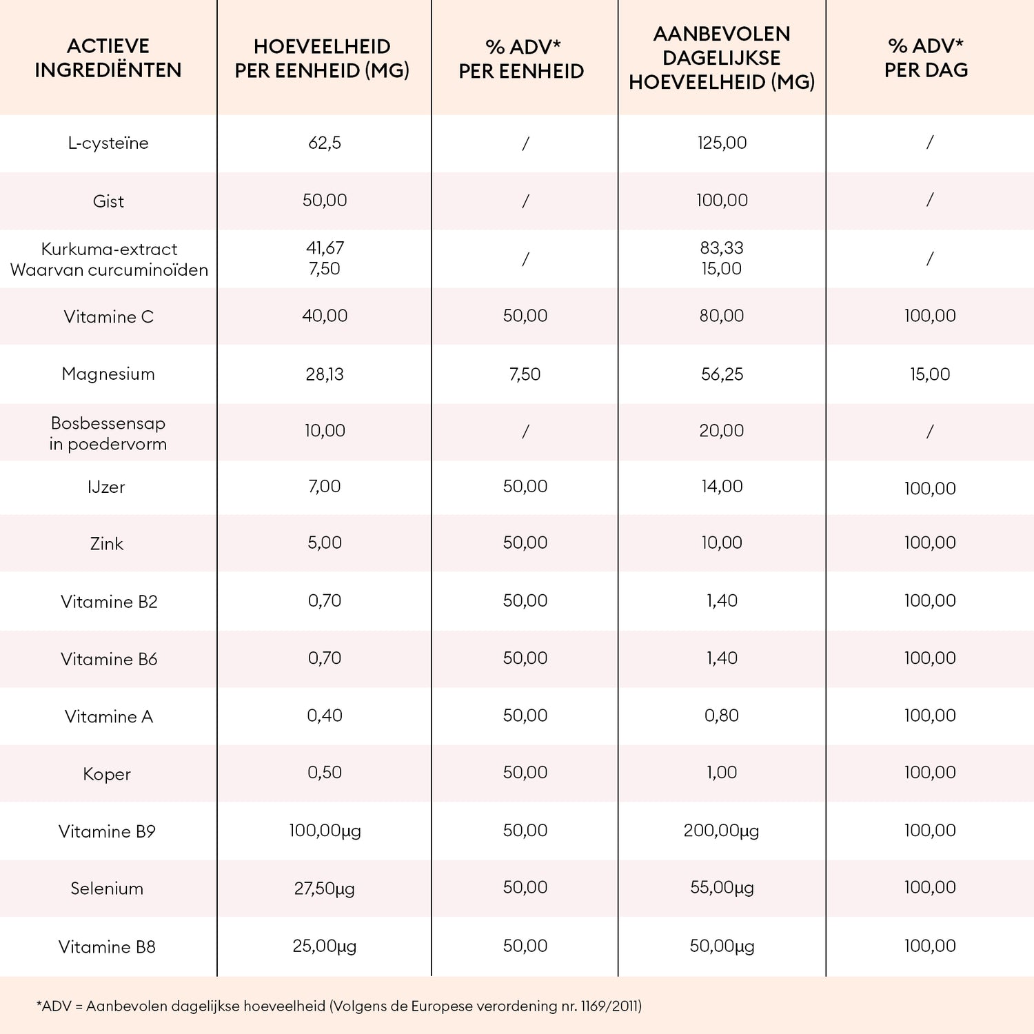 Voedingssupplement op basis van vitamines, mineralen, planten, gist en L cysteïne.