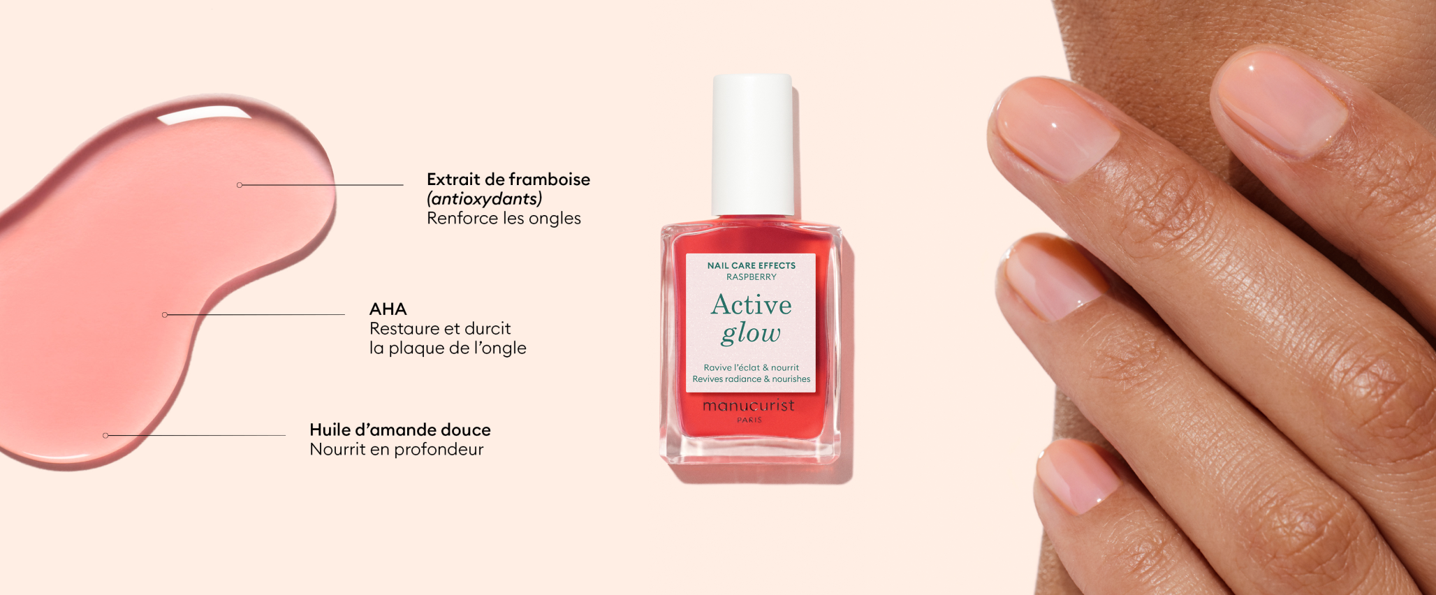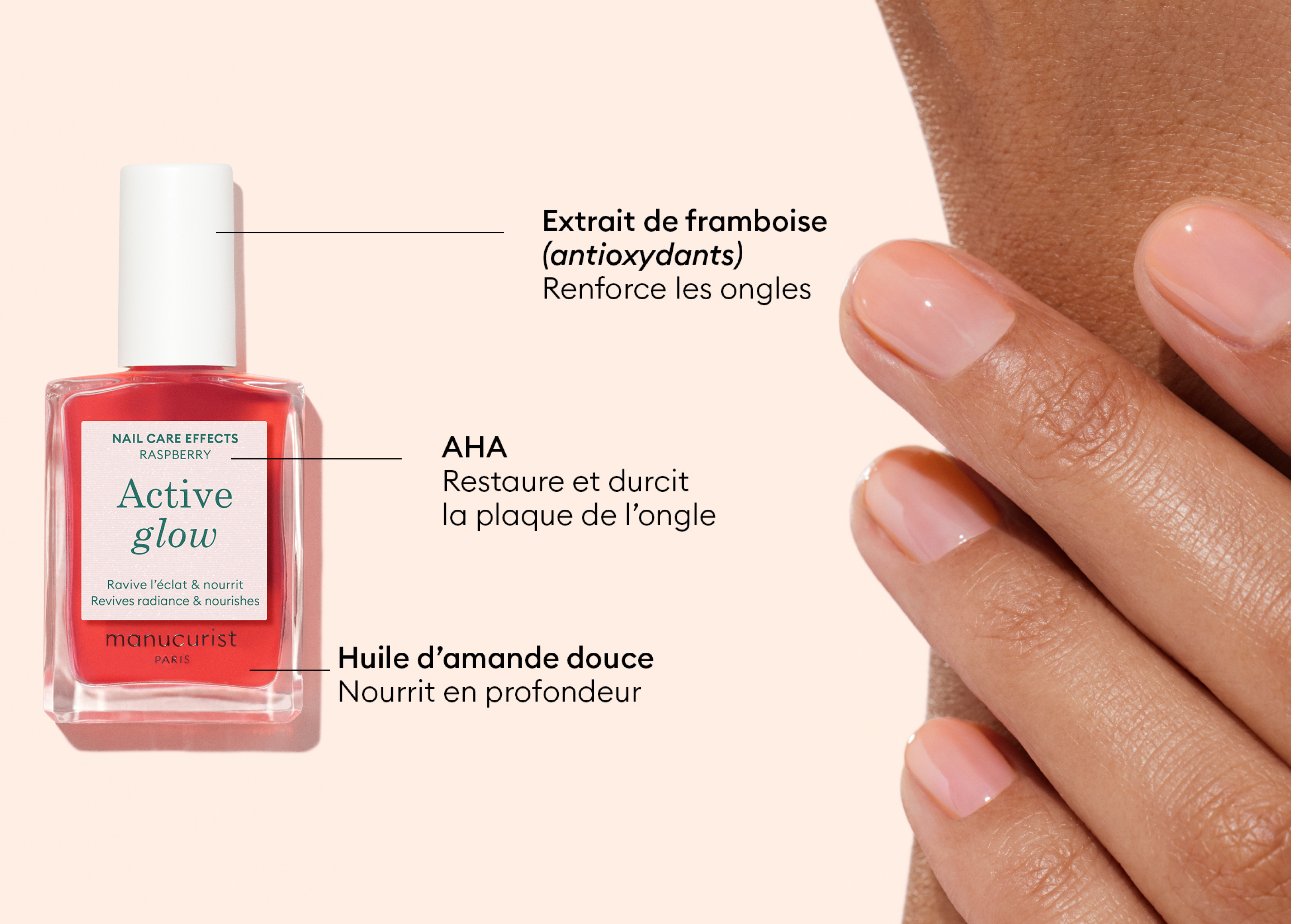 Si vous avez des ongles très abîmés, vous pouvez tout à fait combiner la Base SOS avec notre vernis hybride Active Glow™ pour un effet "bonne mine" immédiat. Sinon, Active Glow™ contient déjà des ingrédients actifs pour prendre soin des ongles : extraits de framboise aux propriétés apaisantes et régénérantes, des AHA particulièrement efficaces pour restaurer et revitaliser les ongles les plus fragiles et de l'huile d'amande douce pour nourrir intensément les ongles et les cuticules. C'est un véritable soin embellisseur 2 en 1.