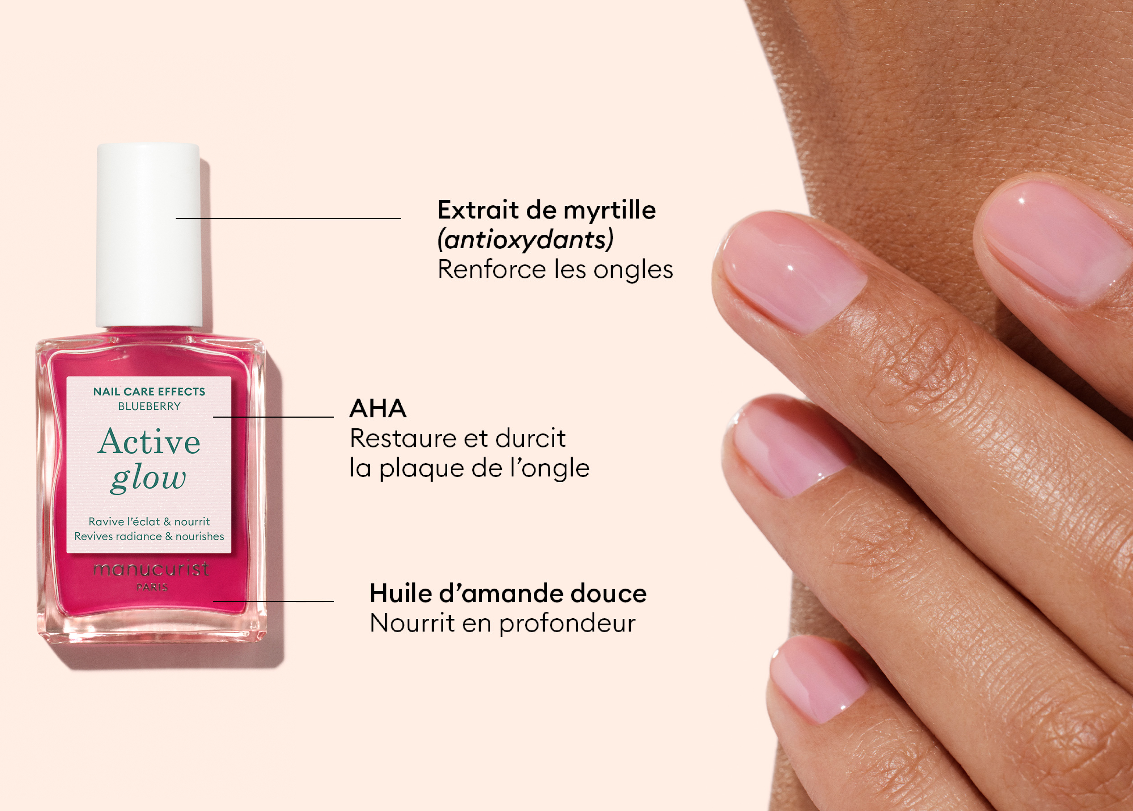 La formule experte d'Active Glow est enrichie en actifs végétaux aux propriétés apaisantes et régénérantes qui offre aux ongles un galbe acidulé et rosé.