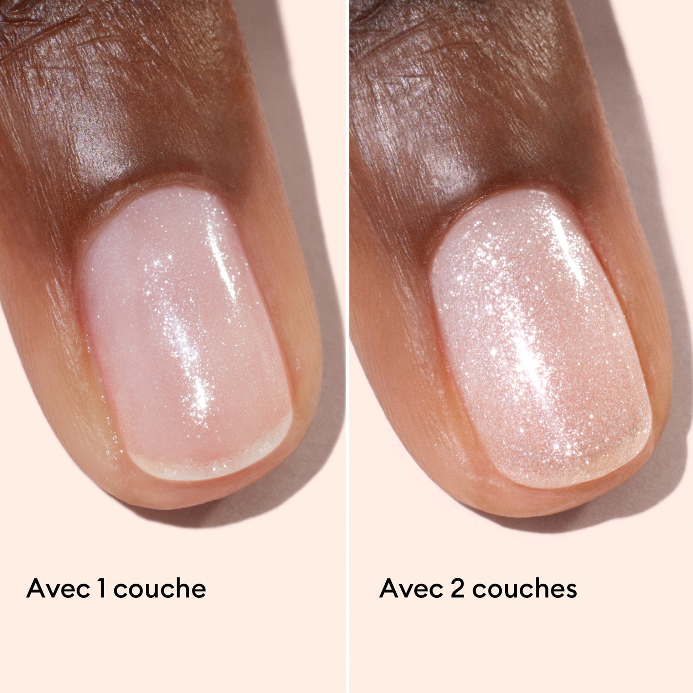 - 1 couche pour un voile nacré, comme une touche de lumière sur l’ongle